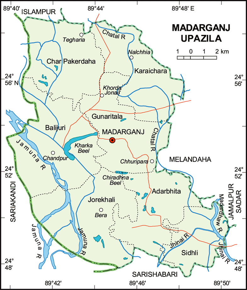 মাদারগঞ্জ উপজেলার ভৌগলিক অবস্থান : ২২৫.৭৩ বর্গকিঃমিঃ আয়তনের মাদারগঞ্জ উপজেলাটি জামালপুর জেলায় অবস্থিত।উপজেলাটি জেলা হতে ৩৪ কিঃমিঃ পশ্চিমে. ও বিভাগ হতে ২২১ কিঃমিঃ উত্তরে অবস্থিত। এর চারপাশে পূর্বে- মেলান্দহ উপজেলার আদরা ইউনিয়ন, ঘােষের পাড়া ইউনিয়ন,. হাজরাবড়ী ইউনিয়ন, জামালপুর সদর উপজেলার মেষ্টা ইউনিয়ন ও সরিষাবাড়ী উপজেলার ভাটারা ইউনিয়ন,দক্ষিনে-সরিষাবাড়ী. উপজেলার সাতপােয়া ইউনিয়ন ও কামরাবাদ ইউনিয়ন, পশ্চিমে-যমুনা নদী ও বগুড়াজেলার সারিয়াকান্দি উপজেলা এবং উত্তরে-. মেলান্দহ উপজেলার মাহমুদপুর ইউনিয়ন ও ইসলামপুর উপজেলার নােয়ারপাড়া ইউনিয়ন অবস্থিত।